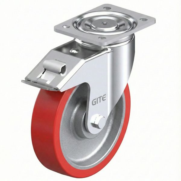 Pressed steel swivel castor, heavy duty design, with top plate fitting, with brake system, heavy duty wheel, polyurethane tread, with cast iron wheel centre
